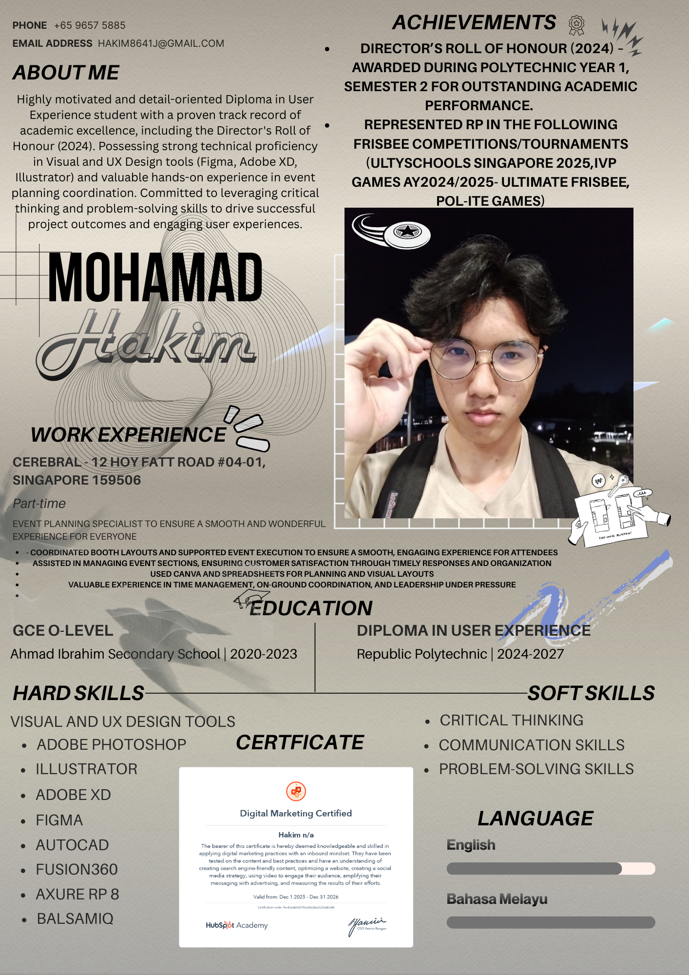 Mohamad Hakim is a dedicated UX student with a blend of design expertise, event-planning experience, and consistent academic achievements. His resume reflects a well-rounded creator who values clarity, precision, and meaningful user experiences.